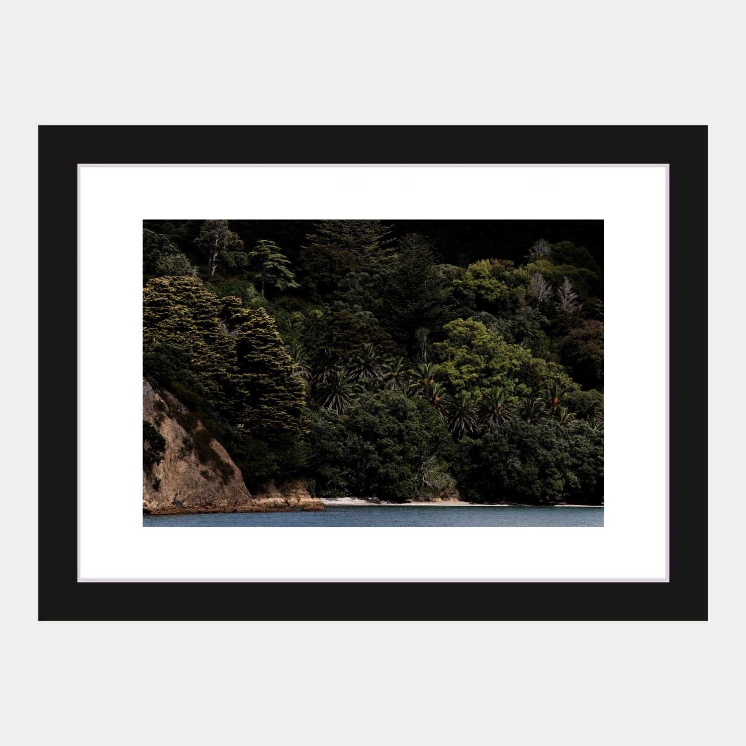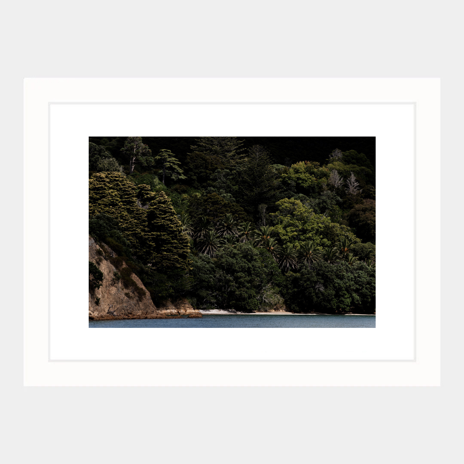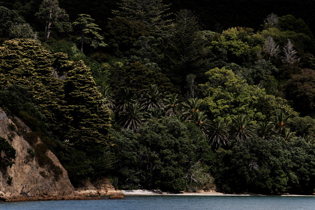 Dark trees rise tall above a narrow shell beach.