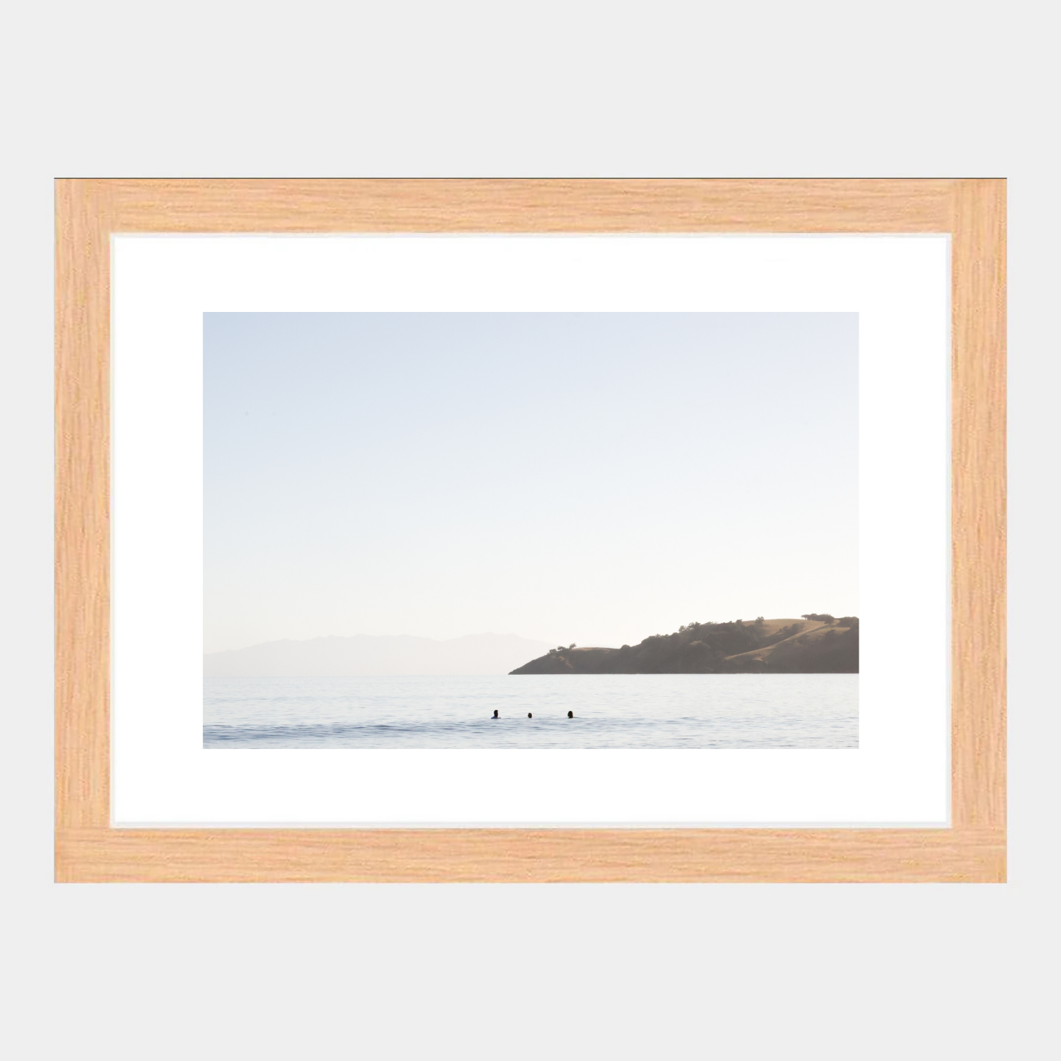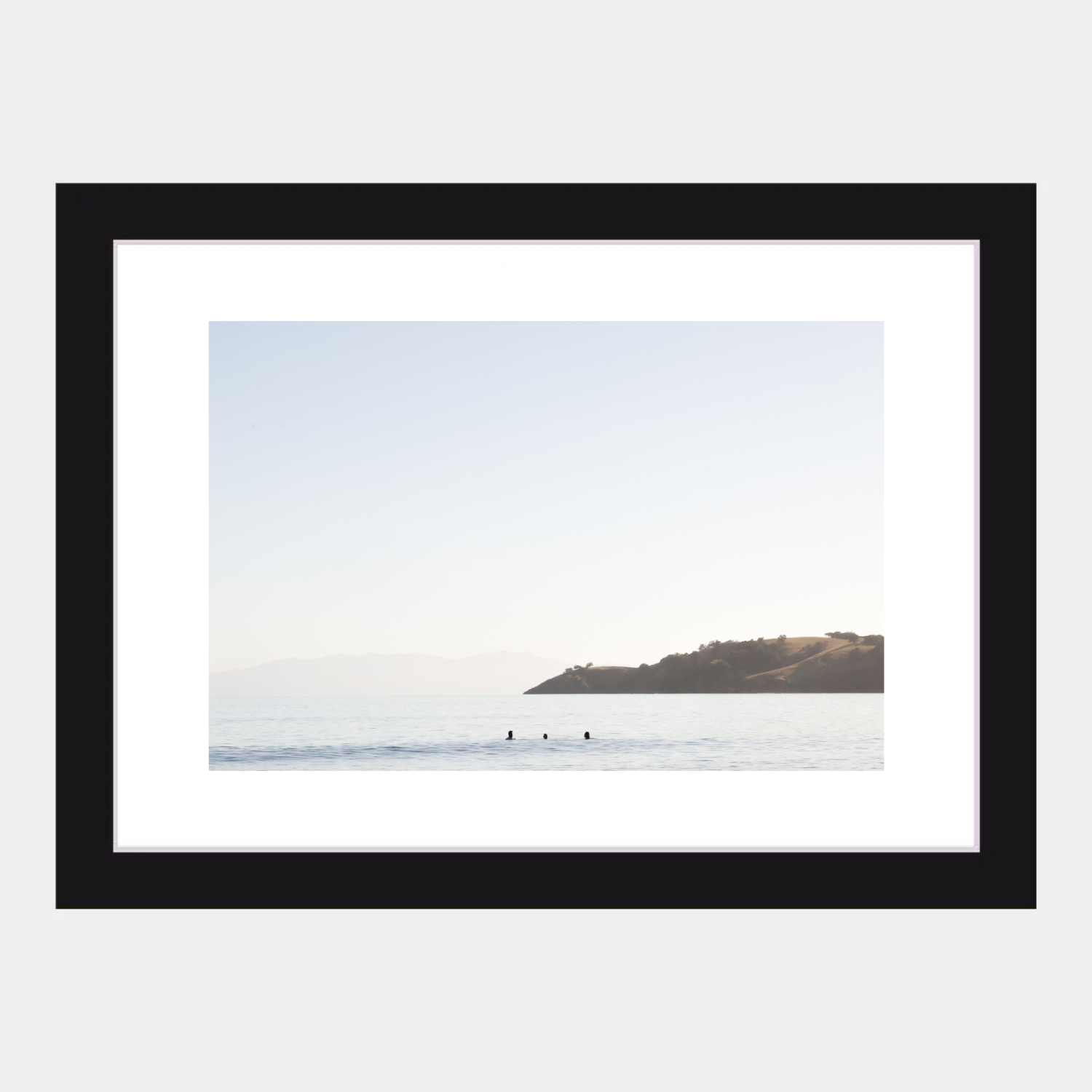 Three swimmers enjoy the calm waters of Onetangi Beach on a clear summer evening.